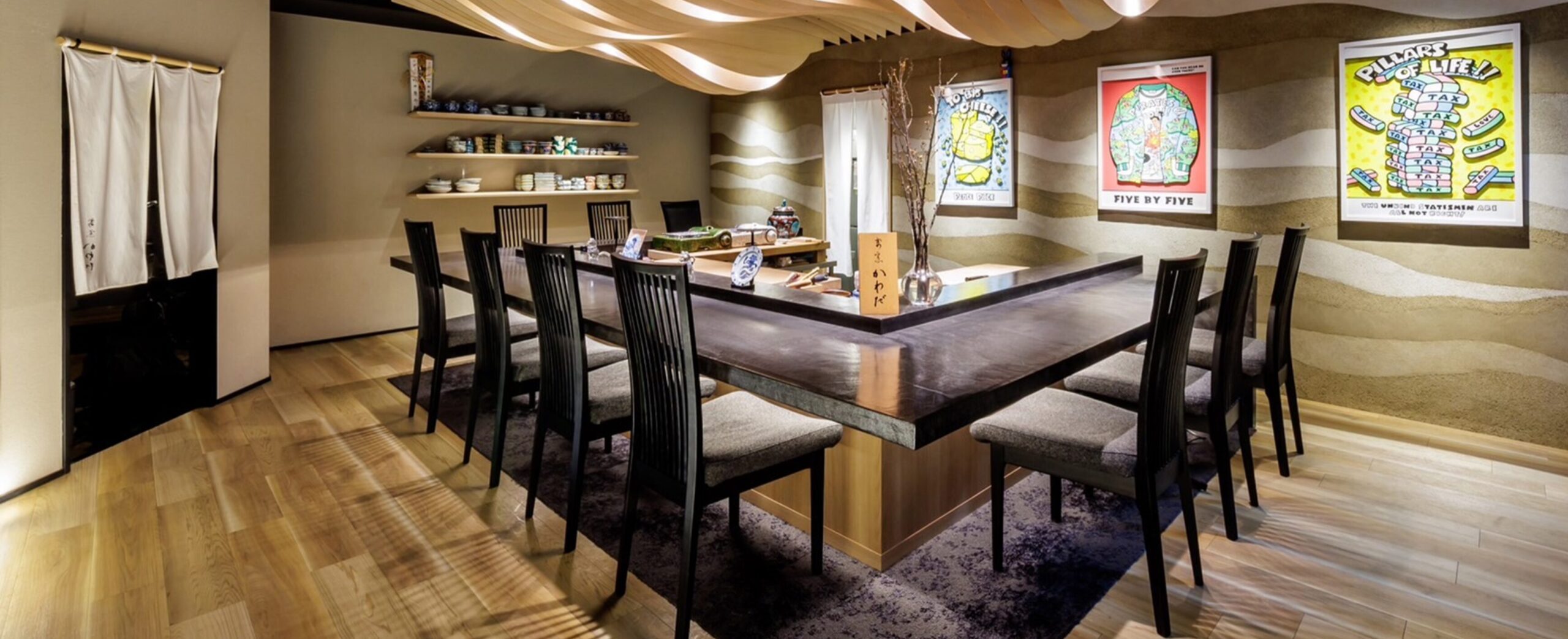 コの字型カウンターのみの店内は、スタイリッシュで洗練された和モダン空間です。最大12席で貸切も可能、接待やグループでの食事にも最適です。和と洋が織り成す美空間で、素敵な一時を過ごせます。